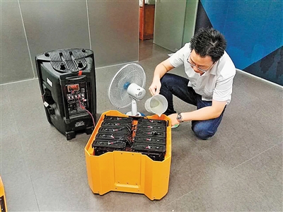 在銀星科技園里的深圳海能動力控股有限公司,總經(jīng)理鄭淞元拿出一個沒有電的安全警示三腳架,他取出電池,將正負極在一個水杯中沾了一下,再將電池裝回去,三腳架立即閃動起來。鄭淞元又拿來一個應(yīng)急發(fā)電手提燈,摳開電池盒記者驚訝地發(fā)現(xiàn)里面沒有電池,只有一盒乳白色的水。鄭淞元用手指沾了沾電池盒里的水,然后將手指頭放在嘴里嘬了一下說:“是鹽水!”