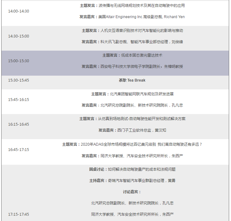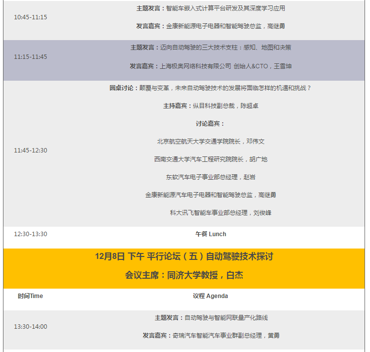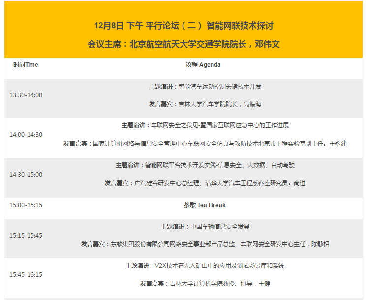 以上主題演講和圓桌討論都將在12月8日的智能網(wǎng)聯(lián)平行論壇展開,除此之外,吉利汽車智能駕駛開發(fā)中心資深總工程師劉衛(wèi)國,法雷奧汽車內(nèi)部控制(深圳)有限公司研發(fā)總監(jiān)付鵬,斑馬網(wǎng)絡副總裁周平,吉林大學汽車學院院長高振海,國家計算機網(wǎng)絡與信息安全管理中心車聯(lián)網(wǎng)安全仿真與攻防技術北京市工程實驗室副主任王永建等都將作為智能網(wǎng)聯(lián)論壇的演講嘉賓,出席論壇并帶來主題發(fā)言。
