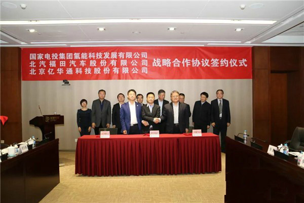 2019年1月23日,國家電投集團氫能科技發(fā)展有限公司(下稱國家電投氫能)、北汽福田汽車股份有限公司(北汽福田)、北京億華通科技股份有限公司(億華通)在北京簽署戰(zhàn)略合作協(xié)議,三方就推動京津冀地區(qū)氫能交通應用示范與推廣達成合作共識,國家電投集團黨組副書記、董事時家林,北汽集團總經(jīng)理、北汽福田董事長張夕勇,億華通董事長張國強等出席簽約儀式。