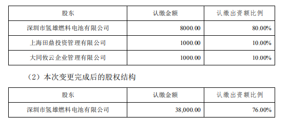 雄韜股份子公司深圳氫雄將向大同氫雄增資3億元