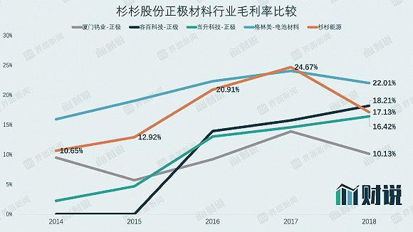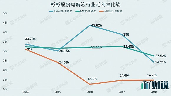 電解液業(yè)務(wù)毛利率同樣處于行業(yè)尾端。杉杉股份電解液業(yè)務(wù)2014以來毛利率便呈現(xiàn)下滑趨勢(shì),截至2018年底毛利率為14.76%,與行業(yè)競爭對(duì)手相差平均十個(gè)百分點(diǎn)。