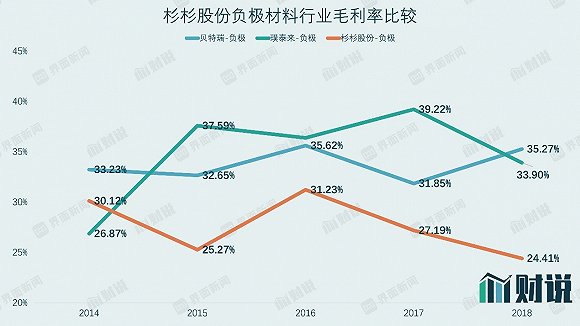負(fù)極材料毛利率則處于行業(yè)尾部,產(chǎn)品競爭力越來越弱。2018年,杉杉股份負(fù)極業(yè)務(wù)毛利率為24.41%,相較璞泰來(603659.SH)及貝特瑞的33.9%和35.27%差距較大。值得注意的是,近5年來,杉杉股份與對(duì)手的差距已由2014年的相等拉大到如今的十個(gè)百分點(diǎn)。