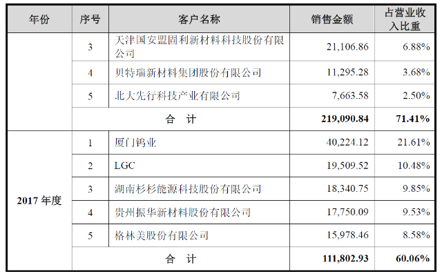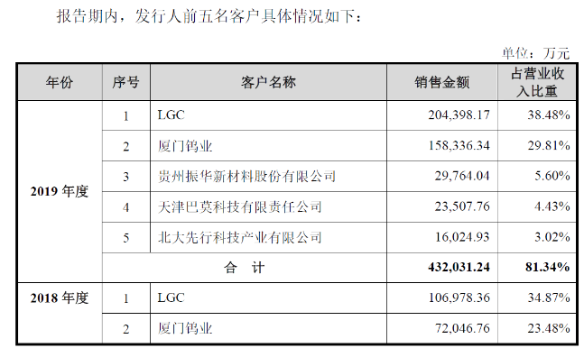 招股書(shū)顯示,報(bào)告期內(nèi),中偉股份前五大客戶銷售金額占當(dāng)期營(yíng)業(yè)收入的比例分別為60.06%、71.41%和81.34%,占比較高且持續(xù)提升,主要是因?yàn)楣究蛻舳酁殇囯姵卣龢O材料行業(yè)龍頭企業(yè),行業(yè)集中度較高,導(dǎo)致公司客戶相對(duì)集中,符合行業(yè)特征。未來(lái),如果公司與主要客戶的合作關(guān)系發(fā)生重大不利變化,或者主要客戶的經(jīng)營(yíng)、財(cái)務(wù)狀況出現(xiàn)重大不利變化,而公司未能及時(shí)培育新的客戶,將對(duì)公司生產(chǎn)經(jīng)營(yíng)和財(cái)務(wù)狀況產(chǎn)生重大不利影響。