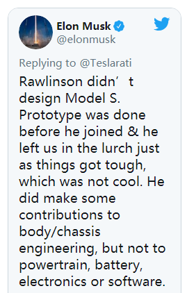 馬斯克發(fā)推澄清Rawlinson并未參與設(shè)計Model S;圖片來源:馬斯克推特截圖