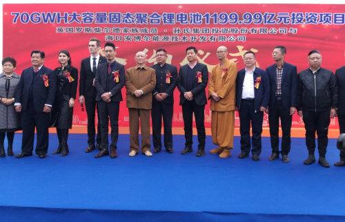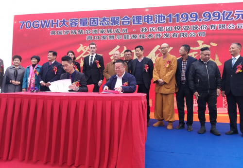 12月15日下午14點38分在惠東喜來登酒店,英國羅斯柴爾德家族成員、孫氏集團投資股份有限公司董事長孫劍先生與?诎膊柲茉醇夹g(shù)開發(fā)有限公司房標(biāo)總裁(CEO)簽訂投資1199.99億元人民幣建設(shè)70GWh單體大容量固態(tài)聚合物鋰子