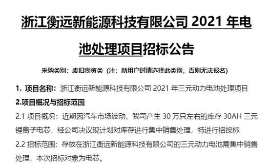 近日吉利旗下電池公司衡遠(yuǎn)新能源就其生產(chǎn)的30萬(wàn)只左右的30Ah三元鋰離子電芯進(jìn)行公開(kāi)銷(xiāo)售招標(biāo)。
