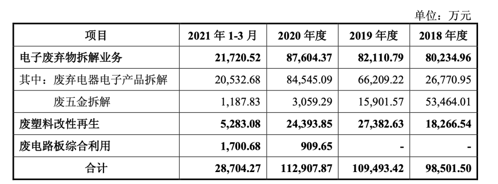 格林循環(huán)的主營(yíng)業(yè)務(wù)之一是電子廢棄物拆解,在2021年第一季度占到主營(yíng)業(yè)務(wù)收入的75.67%。招股書中,格林循環(huán)稱,廢家電拆解業(yè)務(wù)的毛利率甚至高于家電制造企業(yè)平均水平——主要家電制造上市公司毛利率為24.37%,而主要電子廢棄物拆解公司電子廢棄物拆解業(yè)務(wù)毛利率為28.31%。