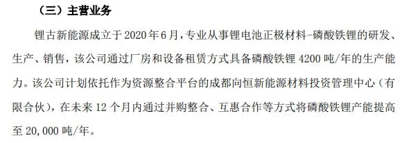 根據(jù)公告披露,聚恒益新材料的核心業(yè)務(wù)是“專業(yè)石墨化”。鋰古新能源專業(yè)從事鋰電池正極材料磷酸鐵鋰的研發(fā)、生產(chǎn)、銷售,該公司通過廠房和設(shè)備租賃方式具備磷酸鐵鋰4200 噸/年生產(chǎn)能力。