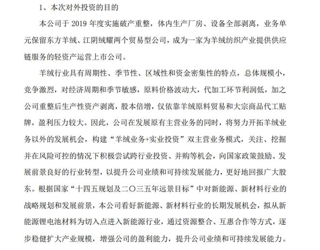 對于上述投資,中銀絨業(yè)表示,是為實現(xiàn)公司羊絨業(yè)務(wù)+實業(yè)投資”雙主業(yè)戰(zhàn)略發(fā)展,逐步穩(wěn)健擴(kuò)大產(chǎn)業(yè)規(guī)模,增強(qiáng)公司盈利能力,提升業(yè)績和可持續(xù)發(fā)展能力。
