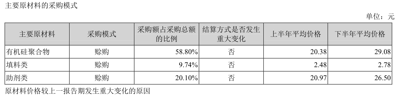 2021年,硅寶科技的營業(yè)收入25.56億元,高出2020年達(dá)10個(gè)億,同比增幅67.74%,凈利潤2.68億元,較2020年也有33%的增長,扣非凈利潤2.45億元,同比增幅31.96%,基本每股收益達(dá)到了0.7024元。不過2021年有機(jī)硅聚合物價(jià)格大幅上漲,導(dǎo)致公司主要原材料采購價(jià)格大幅上漲,比如有機(jī)硅聚合物2021年下半年的平均價(jià)格就比上半年增長了42%。故2021年綜合毛利率為21.8%,2020年為31.84%。