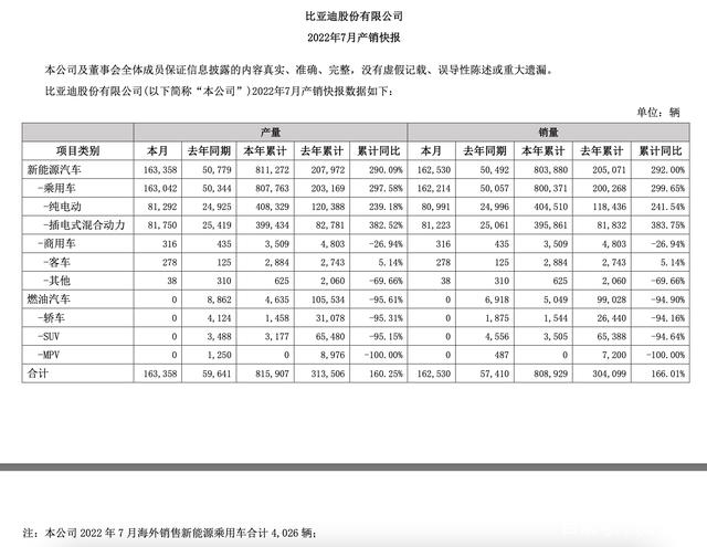 8月3日,比亞迪披露7月產(chǎn)銷快報(bào)。其7月銷量達(dá)162530輛,同比增長(zhǎng)183.1%,其中共銷售新能源乘用車162214輛,同比增長(zhǎng)184.7%。本年累計(jì)銷量803880萬輛,同比增長(zhǎng)292%。