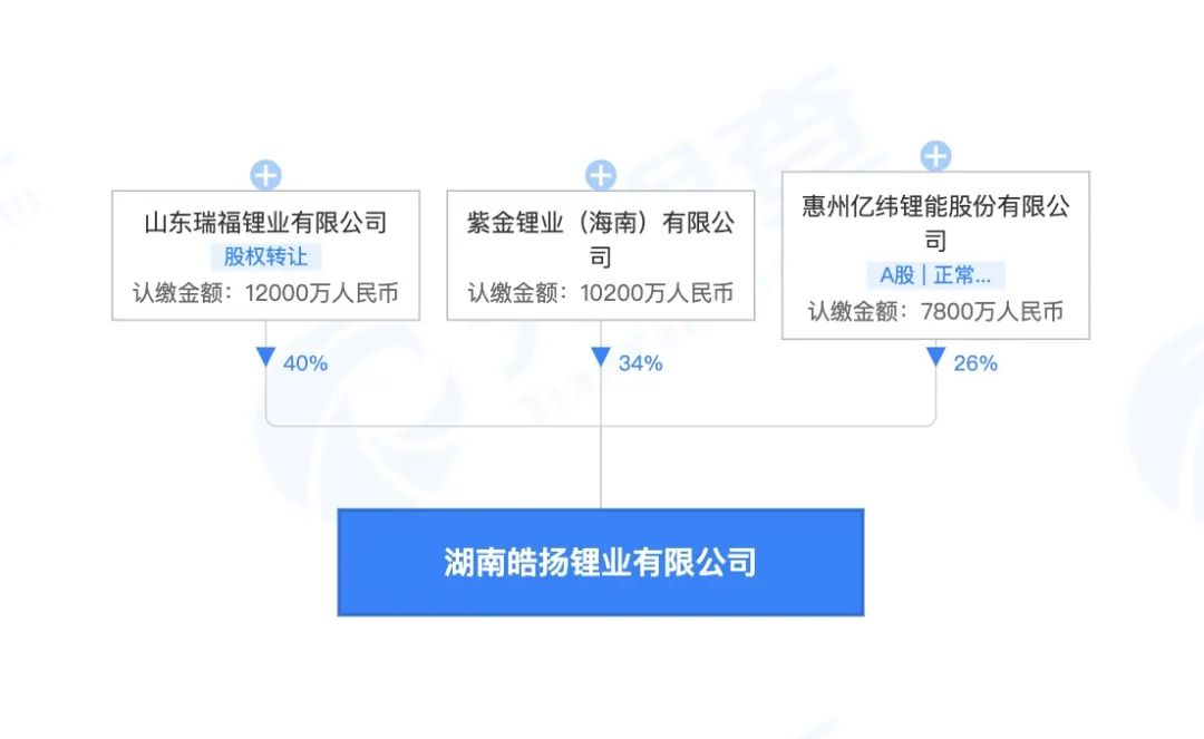 天眼查顯示,湖南皓揚(yáng)鋰業(yè)有限公司(以下簡(jiǎn)稱:皓揚(yáng)鋰業(yè))在11月16日正式成立,注冊(cè)資本3億元人民幣。股東三方包括億緯鋰能、瑞福鋰業(yè)和紫金鋰業(yè),持股比例分別是26%、40%以及34%。
