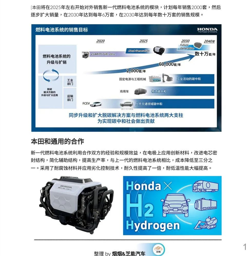 此外,本田汽車還計(jì)劃將該技術(shù)應(yīng)用于更廣泛的領(lǐng)域,包括商用車輛、固定電源和工程機(jī)械等。本田的目標(biāo)是在2025年左右將新一代氫燃料電池系統(tǒng)的年銷量提高到約2,000套,并在2030年提高到6萬套。
