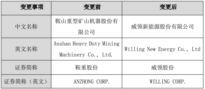 5月11日,鞍重股份公告,擬將公司全稱“鞍山重型礦山機器股份有限公司”變更為“威領新能源股份有限公司”(以市場監(jiān)督管理部門的最終登記為準),擬將證券簡稱“鞍重股份”變更為“威領股份”,擬將