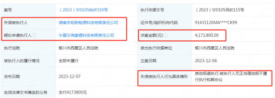 其中,湖南宇拓成為失信被執(zhí)行人的案件申請人為寧夏漢堯富鋰科技有限責(zé)任公司(簡稱:寧夏漢堯),執(zhí)行法院為銀川市西夏區(qū)人民法院,涉案金額417.38萬元。執(zhí)行依據(jù)為“其他規(guī)避執(zhí)行,被執(zhí)行人無正當(dāng)理由拒不履行執(zhí)行和解協(xié)議。”