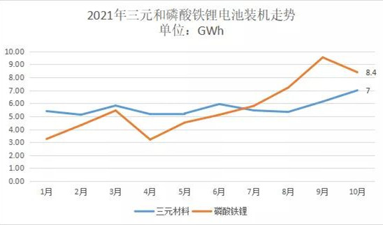 2021年7月起,磷酸鐵鋰電池的裝機(jī)量再次超越三元電池,成為市場(chǎng)主流,而且兩者的差距也在逐月擴(kuò)大,從7月份的0.34GWh以擴(kuò)大至9月的3.4GWh,10月雖有縮小,差距也在1GWh以上。