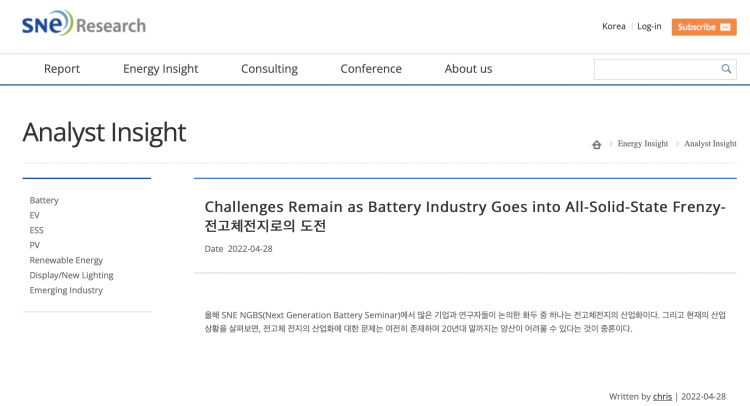 即便是站在風(fēng)口上,固態(tài)電池的實際情況可能并沒那么樂觀。近日,專注新能源、電動汽車等領(lǐng)域的韓國研究機(jī)構(gòu)SNE發(fā)表了一篇文章,也給固態(tài)電池的量產(chǎn)落地潑了一盆冷水。