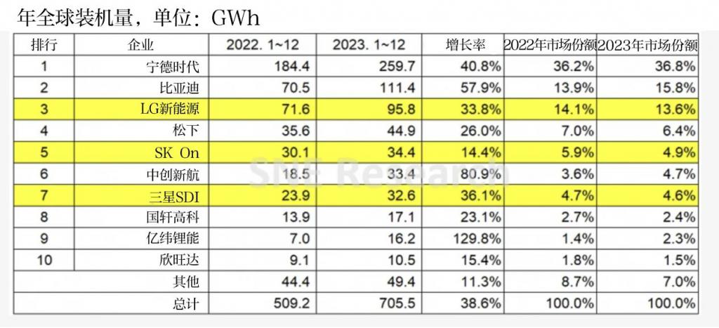 韓系三強 LG 新能源、SK On、三星 SDI 基本上延續(xù)穩(wěn)定了腰部的地位,以 95.8GWh、34.4GWh、32.6GWh 的裝機量,排在第三、五、七位,增幅分別為 33.8%、14.4%、36.1%,屬于平穩(wěn)增長。