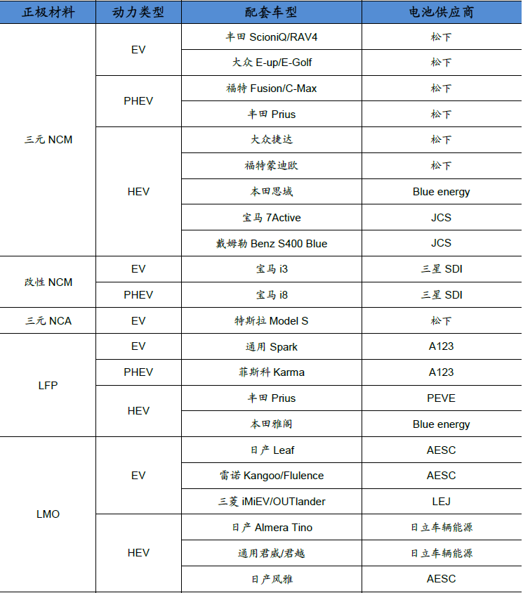 2016年全球新能源汽車主要車型技術路線及電芯供應商