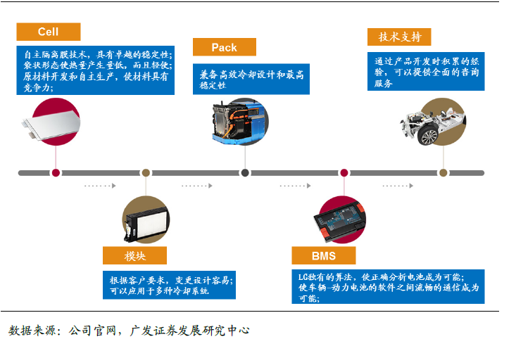 在技術上,LG化學正極采用的主要是三元NCM材料,在電池包裝方面,LG化學大部分采用疊片式軟包設計,是海內外公認的軟包龍頭企業(yè)。軟包鋰電池所用的關鍵材料—正極材料、負極材料及隔膜—與傳統(tǒng)的鋼殼、鋁殼鋰電池之間的區(qū)別不大,最大的不同之處在于軟包裝材料(鋁塑復合膜),這是軟包鋰電池中最關鍵、技術難度最高的材料。軟包電池的包裝材料和結構使其擁有一系列優(yōu)勢。1)安全性能好,軟包電池在結構上采用鋁塑膜包裝,發(fā)生安全問題時,軟包電池一般會鼓氣裂開,不會爆炸。2)重量輕,軟包電池重量較同等容量的鋼殼鋰電池輕40%,較鋁殼鋰電池輕20%。3)內阻小,軟包電池的內阻較鋰電池小,可以極大的降低電池的自耗電。4)循環(huán)性能好,軟包電池的循環(huán)壽命更長,100次循環(huán)衰減比鋁殼少4%~7%。5)設計靈活,外形可變任意形狀,可以更薄,可根據(jù)客戶的需求定制,開發(fā)新的電芯型號。軟包電池的不足之處是一致性較差,成本較高,容易發(fā)生漏液,技術門檻高。
