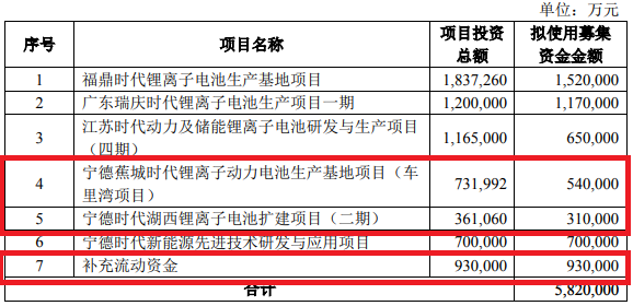 公告顯示,和之前的582億定增相比,調(diào)整后的募集方案去掉寧德時(shí)代湖西鋰離子電池擴(kuò)建項(xiàng)目(二期)擬募資的31億元和補(bǔ)充流動(dòng)資金擬募集的93億元,寧德蕉城時(shí)代鋰離子動(dòng)力電池生產(chǎn)基地項(xiàng)目擬使用募集資金由54億調(diào)整為46億元。