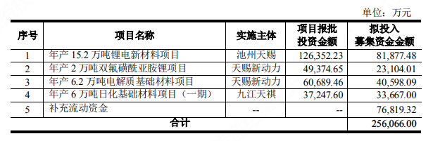 12月10日,天賜材料發(fā)布公告稱,公司擬公開(kāi)發(fā)行可轉(zhuǎn)債募資不超過(guò)25.61億元,扣除發(fā)行費(fèi)用后的募集資金凈額擬全部投向年產(chǎn)15.2萬(wàn)噸鋰電新材料項(xiàng)目、年產(chǎn)2萬(wàn)噸雙氟磺酰亞胺鋰項(xiàng)目、年產(chǎn)6.2萬(wàn)噸電解質(zhì)基礎(chǔ)材料項(xiàng)目、年產(chǎn)6萬(wàn)噸日化基礎(chǔ)材料項(xiàng)目(一期)及補(bǔ)充流動(dòng)資金。