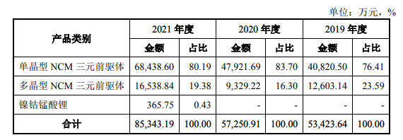 從帕瓦股份招股書來看,2019-2021年,其單晶型NCM三元前驅(qū)體的收入占比均在80%左右。報(bào)告期內(nèi),隨著客戶需求逐步增加、產(chǎn)能提升和自身業(yè)務(wù)結(jié)構(gòu)的調(diào)整,公司單晶型NCM三元前驅(qū)體的銷售收入逐年上升,多晶型NCM三元前驅(qū)體的銷售收入總體上升。